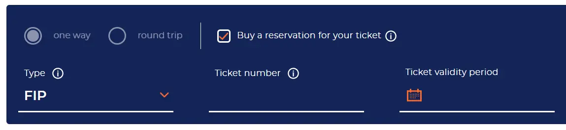 FIP 50 Tickets can be issued on the train but are subject to a special fee (except if the passenger boards at a station without ticket sales). Passengers must board through the front door of the train (in the direction of travel) and buy the ticket from the train staff immediately after boarding.